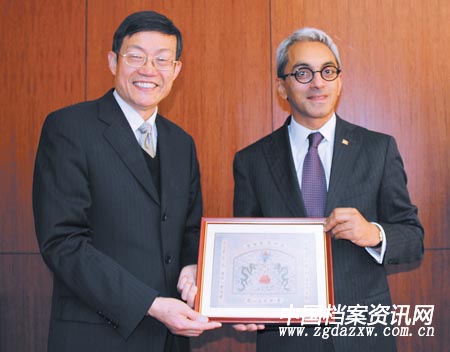 会谈结束后,国家档案局局长杨冬权(左)向葡萄牙国务秘书若热·巴雷托·沙维尔先生赠送了清光绪三十二年(1906年)苏州商会颁发的典当业宝成号入会凭照的仿真复制件。 本报记者 杨太阳 摄