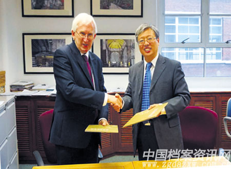 北京市档案馆馆长吕和顺与伦敦市档案馆馆长杰夫·皮克(左)交换友好合作备忘录。 王 凯 摄